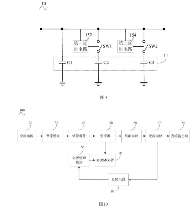 1.開關(guān)電源的啟動(dòng)電路包括:電容電路,電容電路的電容值可調(diào);和與電容電路連接的調(diào)節(jié)器件,調(diào)節(jié)器件用于在開關(guān)電源上電過程中按照設(shè)定時(shí)序調(diào)節(jié)電容電路的電容值以改變啟動(dòng)電路的電容值。電容電路包括多個(gè)電容,多個(gè)電容并聯(lián),調(diào)節(jié)器件包括開關(guān)器件,開關(guān)器件包括與多個(gè)電容連接的至少一個(gè)開關(guān)件,每個(gè)開關(guān)件與至少一個(gè)與電容串聯(lián)。調(diào)節(jié)器件用于調(diào)節(jié)可調(diào)電容的電容值。