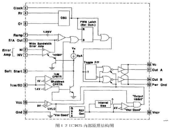 該芯片內(nèi)部電路如圖4-2所示。它由振蕩器、PWM 比較器、限流比較器、過流比較器、基準電壓源、故障鎖存器、軟啟動電路、欠壓鎖定、PWM鎖存器、輸出驅(qū)動器等組成。我們將詳細介紹各部分的情況,以理解開關(guān)電源芯片的工作原理。