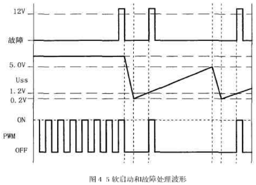 軟啟動和故障處理波形如圖4-5所示。軟啟動是通過軟啟動(SOFT, START)腳的外接電容實現(xiàn)的。接通電源后,軟啟動腳外接電容放電,該腳處于低電平,誤差放大器輸出低電平,開關(guān)電源無輸出電壓。當9uA 的內(nèi)部電流源給軟啟動腳外接電容充電時,誤差放人器輸出電壓逐漸升高,直到閉環(huán)調(diào)節(jié)功能開始T.作,開關(guān)電源輸出電壓逐漸升高到額定值。一旦限流(I LIM)腳的電平超過1.2V,故障鎖存器置位,輸出腳變?yōu)榈碗娖?/span>;同時,軟啟動腳外接電容以250uA的電流放電。在軟啟動電容放完電后,限流腳電平降到1.2V以下時,故障鎖存器就不輸出脈沖。這時,故障鎖存器復位,芯片開始軟啟動過程。