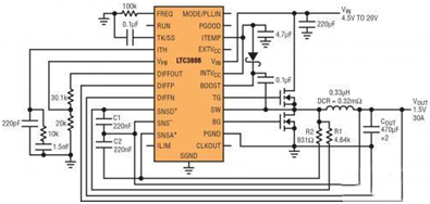 圖 2 顯示了一款以非常低的 DCR 完成采樣的高效率、1.5V/30A 降壓型轉(zhuǎn)換器。在這個設(shè)計中采用了一個 DCR = 0.32m? 的電感器,以最大限度地提高效率。