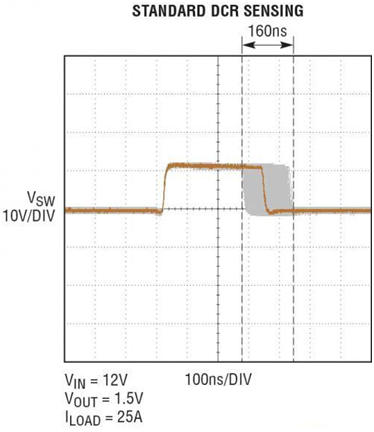 獨特的設(shè)計提高了效率以及噪聲靈敏度。在采用非常低的 0.32m? 電感器 DCR 時,最差情況的開關(guān)節(jié)點抖動減輕了 60%,如圖 5 所示。
