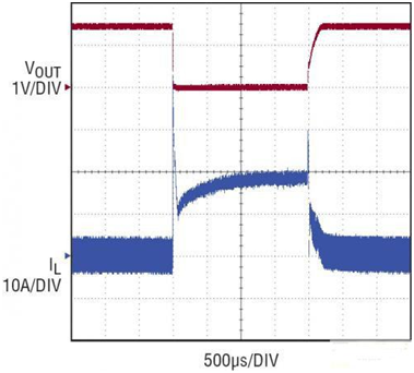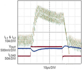 LTC3866 可以與一個電源構(gòu)件一起使用,以實現(xiàn)更緊湊的設(shè)計和非常大的電流。圖 7 顯示了一款由兩個并聯(lián)的 LTC3866 + 電源構(gòu)件電路組成的兩相、高效率、1.5V/80A 電源。盡管該電源構(gòu)件中電感器的 DCR 僅為 0.53m?,但是在 DC 和瞬態(tài)情況下的均流性能是十分出色的 (如圖 8 所示)。