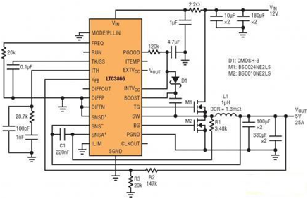 LTC3866 就解決了這個問題,使用該器件可以建立可靠和電流采樣電阻 <0.5m? 的電流模式開關(guān)電源。這款單相同步降壓型控制器用內(nèi)置柵極驅(qū)動器驅(qū)動所有 N 溝道電源 MOSFET 開關(guān)。該器件采用一種獨特的架構(gòu),可提高電流采樣信號的信噪比,從而允許使用 DC 電阻 (DCR) 非常低的功率電感器或電阻值非常低的電流采樣電阻器,以最大限度地提高大電流應(yīng)用的效率。這種特性可降低在 DCR 很低的應(yīng)用中常見的開關(guān)抖動。