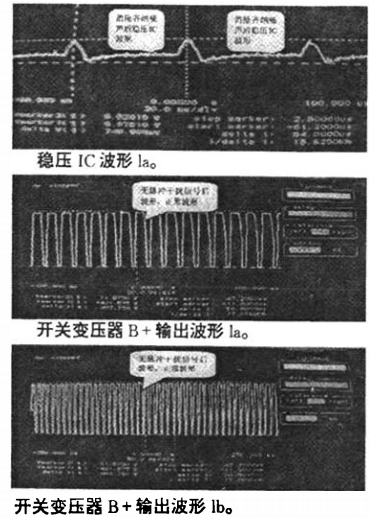 通過在TL431并聯(lián)0.47/63V電容后,再次測試TL431穩(wěn)壓TC負極波形,不規(guī)則噪聲頻率消失(如圖穩(wěn)壓ICla);測試開關變壓器次級B+波形(如圖開關變壓器次級B+波形1a、1b),波形中130uS-70uS周期脈沖干擾信號消失;此時再也聽不到變壓器“哧哧”響聲。具體測試經上述更改后整機哧、哧聲消失,并且對正常工作無任何影響。使電源工作更穩(wěn)定。