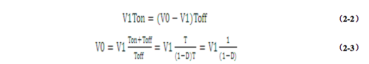 現(xiàn)在來講講開關(guān)電源的電路工作原理:Boost電路即升壓電路,當(dāng)Q1導(dǎo)通時,能量從輸入電源流入儲存于電感L1中,此刻二極管D1反偏,負(fù)載由濾波電容C1供給能量,將C1中儲存的電能(C1V02/2)釋放給負(fù)載R1。當(dāng)Q1截止時,電感L1中電流不能突變,此刻二極管D1導(dǎo)通,電感中儲存的能量(L1I2/2)經(jīng)二極管D1,流入電容C1,并供給負(fù)載R1。依據(jù)電感的伏秒平衡,在一個周期內(nèi)電感的伏秒乘積和為零。如果Q1導(dǎo)通時間Ton越大,那么Q1截止時提供給負(fù)載的電壓就會越大。下面通過具體的計算來加深了解:根據(jù)伏秒平衡有式(2-2)、(2-3)