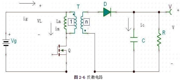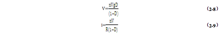 現(xiàn)在來分析它的工作原理:當(dāng)Q導(dǎo)通時,二極管截止,根據(jù)電路知識可知此時VL=Vg,ic=-V/R;當(dāng)Q截止時,二極管D導(dǎo)通,VL=-V/n,ic=i/n-V/R。由伏秒平衡和電容充放電平衡可得:
