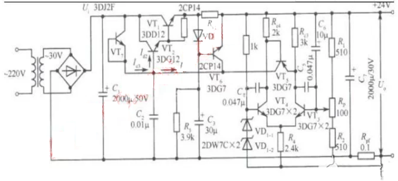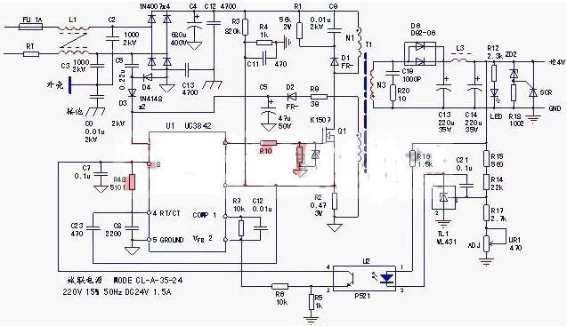 U1芯片和1、2腳外圍元件R7、C12,也是穩(wěn)壓回路的一部分。實際上,TL1、U1組成了(相對于U1內(nèi)部電壓誤差放大器)外部誤差放大器,將輸出24V的電壓改變反應回U1的反應電壓信號輸入端。