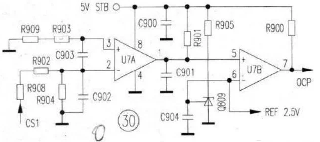 作業(yè)電流檢測從電阻R2上獲得,當毛病狀況引起作業(yè)過流反常增大時,U1的6腳輸出PWM脈沖占空比減小,N1自供電繞組的感應電路也隨之降低,當U1的7腳供電電壓低于10V時,電路停振,負載電壓為0,這是過流(過載或短路)引發(fā)U1內(nèi)部欠電壓維護電路動作導致的輸出間斷;作業(yè)電流反常增大時,R2上的電壓降大于1V時,內(nèi)部鎖存器動作,電路停振,這是由過流引發(fā)U1內(nèi)部過流維護動作導致輸出間斷。