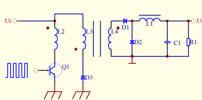 這種開關(guān)電源電路,輸出功率較大(不管Q1導(dǎo)通與截止,都有能量傳遞到負(fù)載上)―但是存在問題是:變壓器結(jié)構(gòu)雜亂,體積較大,所以其實踐使用很少。