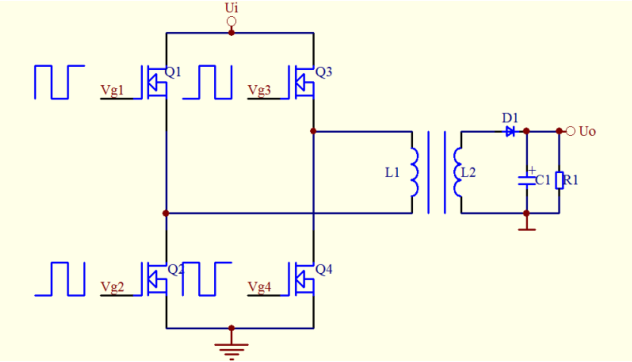 全橋式:電路由Q1、Q2、Q3、Q4組成橋式電路,如圖中所給出的信號,Q1和Q4先導(dǎo)通,Q2、Q3截止。電流流向:電源正→Q1→L1→Q4→電源負(fù)。后半周Q1、Q4截止,Q2、Q3導(dǎo)通,電流流向:電源正→Q3→L1→Q2→電源負(fù)。控制電路略微有點雜亂,需求四組不共地的驅(qū)動信號。電路不允許Q1和Q2一起導(dǎo)通,也不允許Q3和Q4一起導(dǎo)通,一起導(dǎo)公例意味著電源短路,Q1、Q2、Q3、Q4會炸飛的。一起假如Q1、Q4與 Q2、Q3的導(dǎo)通時間不對稱,那么,L1的交通電壓就會呈現(xiàn)很大的直流重量,造成磁飽滿。