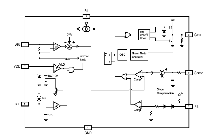 5.內(nèi)建電壓補償電路可在一個較大的AC輸入范圍內(nèi)完成功率限制操控,并供給過載、短路維護功用。此外,還設(shè)有低電壓鎖定(UVLO)功用,使作業(yè)更穩(wěn)定、牢靠。