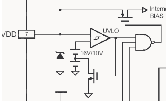 SG6841采用了欠壓鎖定比較器來確保輸出級被驅(qū)動之前,集成電路已完全可用。欠壓鎖定回路其實質(zhì)是一個滯回比較器,以防止在通過它們各自的門限時產(chǎn)生過錯的輸出動作。它的開啟電壓為16V,關(guān)閉電壓為10V。在啟動過程中,比較器反向輸入端為16V,當VDD<16V時,比較器輸出為低電平,SG6841無法工作。當VDD升到16V時,欠壓鎖定器輸出為高電平,SG6841正常工作,同時MOS管導通,使比較器反向輸入端為10V。當VDD下降至10V時,欠壓鎖定器的輸出回到低電平,整個電路停止工作.SG6841的7腳端設(shè)置了一個32V的齊納二極管,確保內(nèi)部電路肯定工作在32V以下,以防電壓過高損壞芯片。