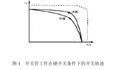 (d)二極管反向恢復(fù)問題:二極管由導(dǎo)通變?yōu)榻刂箷r存在著反向恢復(fù)期,在此期間內(nèi),二極管仍處于導(dǎo)通狀況,若當(dāng)即注冊與其串聯(lián)的開關(guān)器材,簡單造成直流電源瞬間短路,發(fā)生很大的沖擊電流,輕則引起該開關(guān)器材和二極管耗急劇添加,重則致其損壞。圖4給出了接理性負(fù)載時,開關(guān)管作業(yè)在硬開關(guān)條件下的開關(guān)的開關(guān)軌道,圖中虛線為雙極性晶體管的安全作業(yè)區(qū)(Safetyoperation area,SOA),如果不改進(jìn)開關(guān)管的開關(guān)條件,其開關(guān)軌道很可能會超出安全作業(yè)區(qū),導(dǎo)致開關(guān)管的損壞。