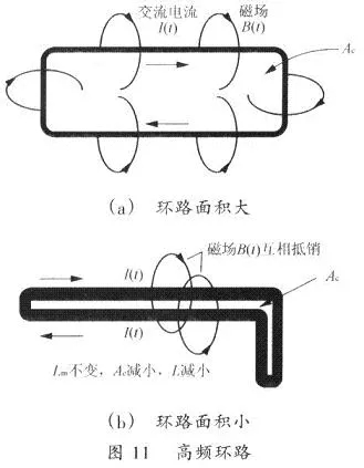 1.4高頻環(huán)路開關(guān)電源中有許多由功率器材所組成的高頻環(huán)路,假如對(duì)這△環(huán)路處嬋得欠好的話,就會(huì)對(duì)電源的正常作業(yè)形成很大影響。為了減小高頻環(huán)路所發(fā)生的電磁波噪音,該環(huán)路的面積應(yīng)該操控得十分小。如圖l1(a)所示,高頻電流環(huán)路面積很大,就會(huì)在環(huán)路的內(nèi)部和外部發(fā)生很強(qiáng)的電磁于擾。同樣的高頻電流,當(dāng)環(huán)路面積規(guī)劃得十分小時(shí),如圖11(b)所示,環(huán)路內(nèi)部和外部電磁場(chǎng)互相抵消,整個(gè)電路會(huì)變得十分安靜。