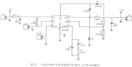 4、開關(guān)電源PCB排版例2圖22是另一種降壓式開關(guān)電源,該電源能使12V輸入電壓轉(zhuǎn)換成3.3V輸出電壓,輸出電流可達(dá)3A。此電源上運(yùn)用了一個(gè)集成電源操控器(Semtech類型SC4519)。這種操控器將一個(gè)功率管集成在電源操控器芯片中。這樣的電源十分簡(jiǎn)略,尤其合適應(yīng)用在便攜式DVD機(jī),ADSL,機(jī)頂盒等消費(fèi)類電子產(chǎn)品。