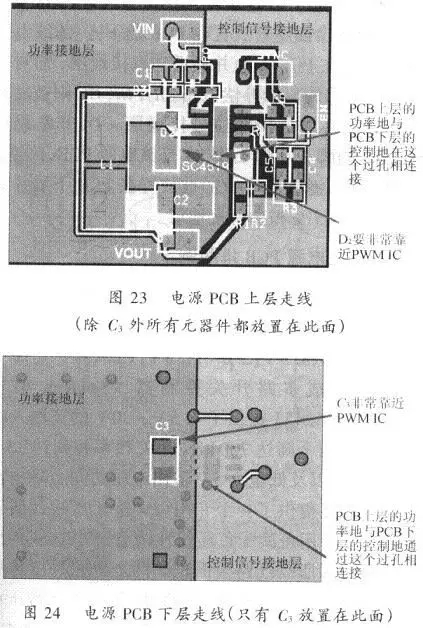 圖23是該電源PCB上層排版圖。為了力便讀者理解,功率接地層和操控信號(hào)接地層別離用不同色彩來表明。在這里輸入插座被放置在PCB的上方,而輸出插座被放置在PCB的下方.濾波電感(L1)被放在PCB左邊并挨近功率接地層,而關(guān)于噪音較敏感的反應(yīng)補(bǔ)償電路(R3,C4,C5)則被放存PCB右邊并挨近操控信號(hào)接地層。D2十分挨近SC4519的腳3及腳4。圖24是該電源PCB下層排版圖。輸入濾波電容(C3)被放置在PCB下層并十分挨近SC4519和功率接地層。