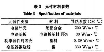 材料參數(shù):該電路中涉及的材料包括鋁合金、銅、塑料和電路基板材料-FR4。表3為元器件材料的主要參數(shù)。