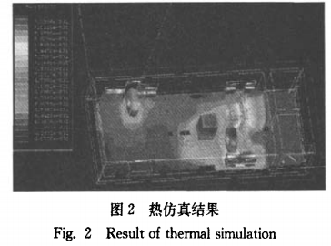 根據(jù)主要發(fā)熱元器件的損耗計(jì)算公式,得到各損耗值,將其導(dǎo)入仿真軟件;利用Ansoft仿真軟件的內(nèi)部求解器獲得實(shí)際電路的3D發(fā)熱模型,如圖2所示。從圖中可以清晰地看到電路內(nèi)部及各個(gè)元器件上的熱量分布情況。根據(jù)仿真結(jié)果(圖2)可知,功率MOSFET上的熱量和變壓器的熱量最高(紅色部分),這與從電路理論上分析求得的這兩種器件的功耗(見表2)相吻合。