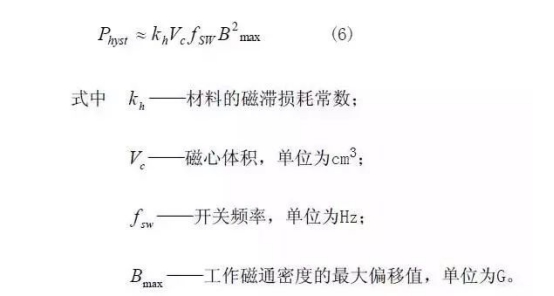 磁滯損耗與繞組的匝數(shù)和驅(qū)動(dòng)辦法有關(guān)。它選擇了每個(gè)作業(yè)周期在B-H曲線內(nèi)掃過的面積。掃過的面積就是磁場(chǎng)力所作的功,磁場(chǎng)力使磁心內(nèi)的磁疇重新排列,掃過的面積越大,磁滯損耗就越大。該損耗由式(6)給出。