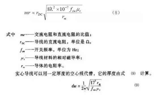 電阻損耗是變壓器或電感內(nèi)部繞組的電阻產(chǎn)生的損耗。有兩種方法的電阻損耗:直流電阻損耗和集膚效應(yīng)電阻損耗。直流電阻損耗由繞組導(dǎo)線的電阻與流過的電流有效值二次方的乘積所選擇。集膚效應(yīng)是因?yàn)樵趯?dǎo)線內(nèi)強(qiáng)交流電磁場(chǎng)效果下,導(dǎo)線中心的電流被“面向”導(dǎo)線外表而使導(dǎo)線的電阻實(shí)踐添加所致,電流在更小的截面中活動(dòng)使導(dǎo)線的有效直徑顯得小了。式(8)給出了這兩個(gè)損耗在一個(gè)表達(dá)式中的計(jì)算式。