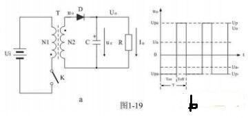圖1-19-a是反激式變壓器開關(guān)電源的簡單作業(yè)原理圖,圖1-19-a中,Ui是開關(guān)電源的輸入電壓,T是開關(guān)變壓器,K是控制開關(guān),C是儲能濾波電容,R是負(fù)載電阻。