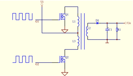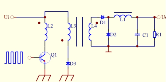 該種開關(guān)電源成本較低,能夠輸出多組不同的電壓,電壓調(diào)整方便,因而運(yùn)用非常廣泛。首要缺點(diǎn)是:紋波電壓較大(一個(gè)周期僅作業(yè)半個(gè)周期左右)。另一點(diǎn)便是,當(dāng)Q截止時(shí),Q1接受很大的反向電壓。U=2Ui,所以Q1選擇耐壓較大的。