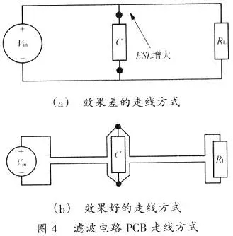 圖4閃現(xiàn)了在一個PCB上輸入電源(Vin)至負載(RL)的不同走線辦法。為了下降濾波電容器(C)的ESL,其引線長度應(yīng)盡量減短;而Vin。正極至RL和Vin負極至R1的走線應(yīng)盡量靠近。