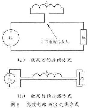 圖8閃現(xiàn)了在一個PCB上Vin通過L至負載(RL)的不同走線辦法。為了下降電感的Cp,電感的二個引腳應(yīng)盡量遠離。而Vin正極至RL和Vin負極至RL的走線應(yīng)盡量靠近。