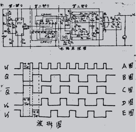 第二局部:這局部是由JK觸發(fā)器CD4027(只用一個y和四個輸入或非門CD4001(只用2個)組成。這局部電路完成脈沖信號的邏輯關(guān)系。V作為K觸發(fā)器的時鐘信號。每當時鐘信號的降落沿到來時,JK觸發(fā)器的Q端和Q端電平都將發(fā)作反轉(zhuǎn),如圖B和圖C。由于或非門的2角和5角信號為V,1角信號為Q.6角信號為Q,我們曉得或非門只要輸人端同時為低電平常.輸出才為高電平。所以3角輸出波形V如圖D.4角輸出波形V,如圖E,它們的脈沖寬度為Tw。
