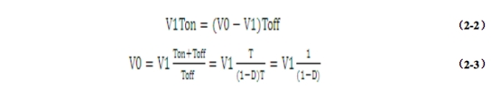 現(xiàn)在來講講開關(guān)電源的電路作業(yè)原理:Boost電路即升壓電路,當(dāng)Q1導(dǎo)通時(shí),能量從輸入電源流入儲存于電感L1中,此刻二極管D1反偏,負(fù)載由濾波電容C1供給能量,將C1中儲存的電能(C1V02/2)釋放給負(fù)載R1。當(dāng)Q1截止時(shí),電感L1中電流不能突變,此刻二極管D1導(dǎo)通,電感中儲存的能量(L1I2/2)經(jīng)二極管D1,流入電容C1,并供給負(fù)載R1。依據(jù)電感的伏秒平衡,在一個(gè)周期內(nèi)電感的伏秒乘積和為零。假如Q1導(dǎo)通時(shí)刻Ton越大,那么Q1截止時(shí)供給給負(fù)載的電壓就會越大。下面通過具體的計(jì)算來加深了解:依據(jù)伏秒平衡有式(2-2)、(2-3)。