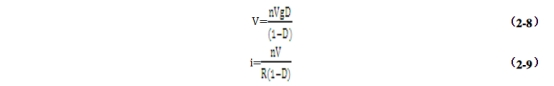 現(xiàn)在來剖析它的作業(yè)原理:當(dāng)Q導(dǎo)通時(shí),二極管截止,依據(jù)電路知識可知此刻VL=Vg,ic=-V/R;當(dāng)Q截止時(shí),二極管D導(dǎo)通,VL=-V/n,ic=i/n-V/R。由伏秒平衡和電容充放電平衡可得: