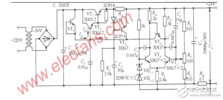 實(shí)用電路如下圖,比例電阻R1和R2的阻值之比設(shè)置為1:18.51,輸出電壓就等于24伏。
