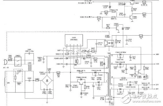 3、保護(hù)回路:U1芯片本身和3腳外圍電路構(gòu)成過流保護(hù)回路;N1繞組上并聯(lián)的D1、R1、C9元件構(gòu)成了開關(guān)管的反向電壓吸收保護(hù)電路,以提供Q1截止時(shí)的反向電流通路,保障Q1的工作安全;實(shí)質(zhì)上穩(wěn)壓回路的電壓反饋信號,也可看作是一路電壓保護(hù)信號——當(dāng)反饋電壓幅度達(dá)一定值時(shí),電路實(shí)施停振保護(hù)動(dòng)作;24V的輸出端并聯(lián)有由R18、ZD2、單向晶閘管SCR組成的過壓保護(hù)電路,當(dāng)穩(wěn)壓電路失常,引起輸出電壓異常上升時(shí),穩(wěn)壓二極管ZD2的擊穿為SCR提供觸發(fā)電流,SCR的導(dǎo)通形成一個(gè)“短路電流”信號,強(qiáng)制U1內(nèi)部保護(hù)電路產(chǎn)生過流保護(hù)動(dòng)作,電路處于停振狀態(tài)。